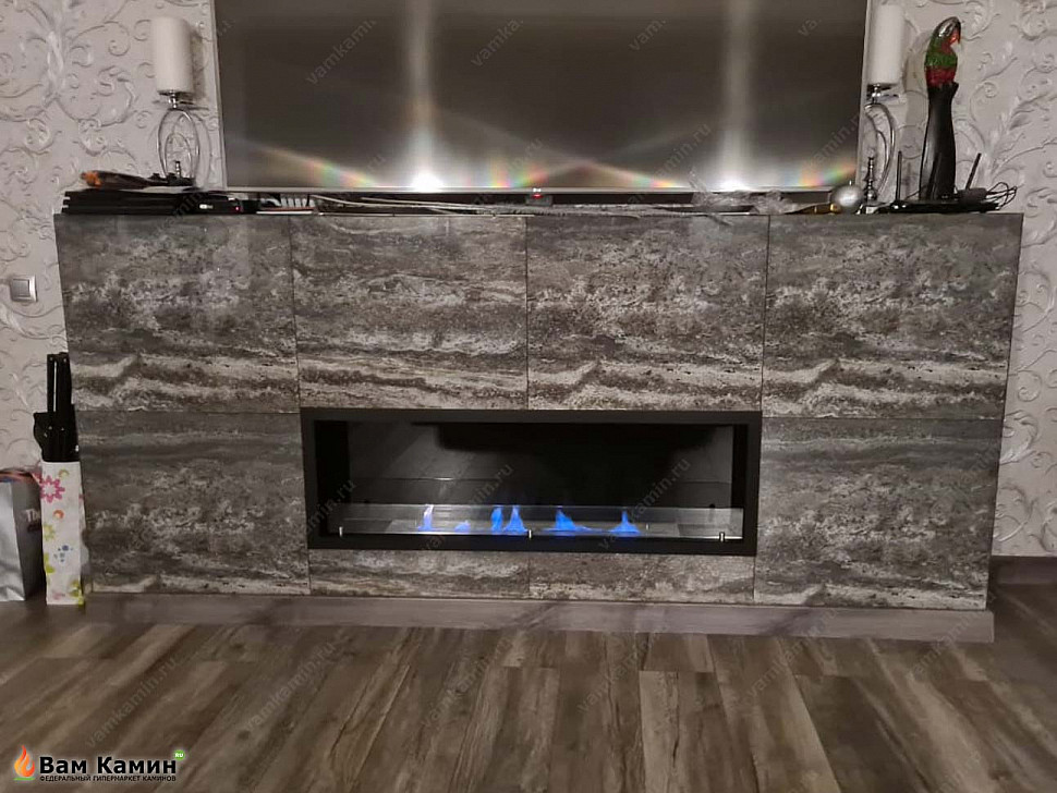 Биокамин в нишу SteelHeat LEADER 1300 модифицировали на заказ под размеры ниши с мраморной облицовкой. Черный цвет биокамина акцентировано выделяется на фоне мрамора, а свет горящего пламени наполняет комнату комфортом и теплом. Линия огня в 90 см делает этот прибор хорошим дополнительным источником обогрева. Огонь отгорожен защитной планкой закаленного стекла. Сзади стоит экран из стемалита, который заметно увеличивает объем пламени.
